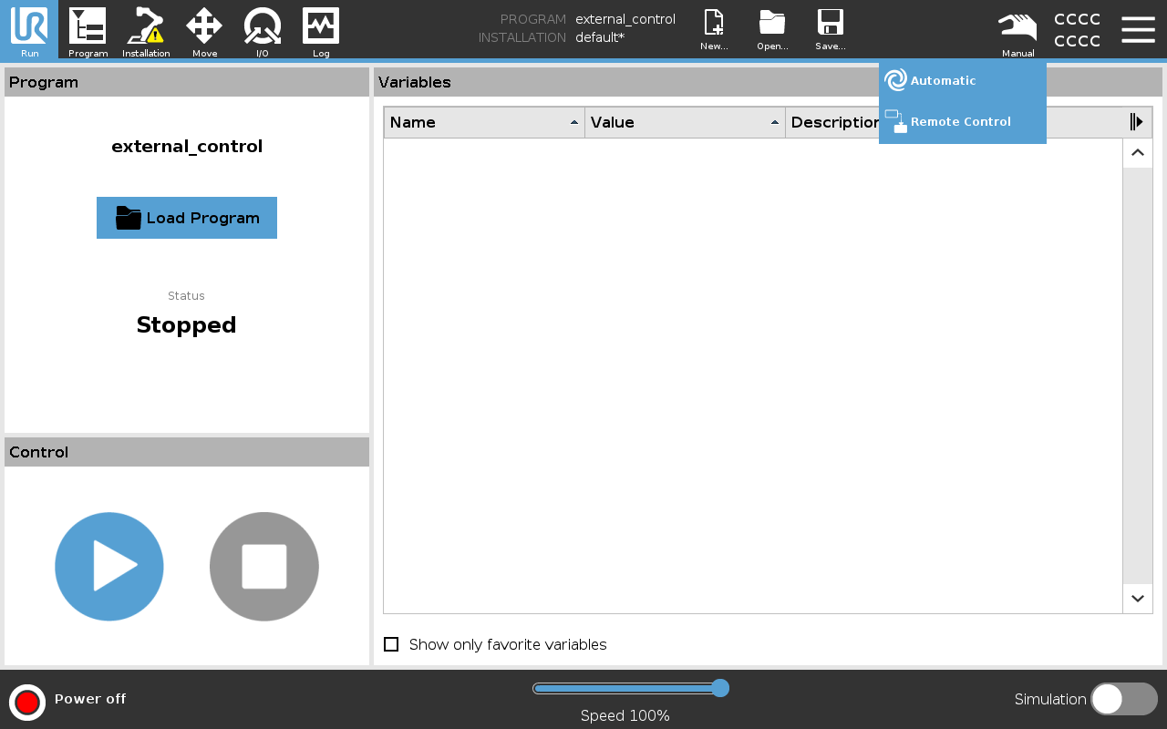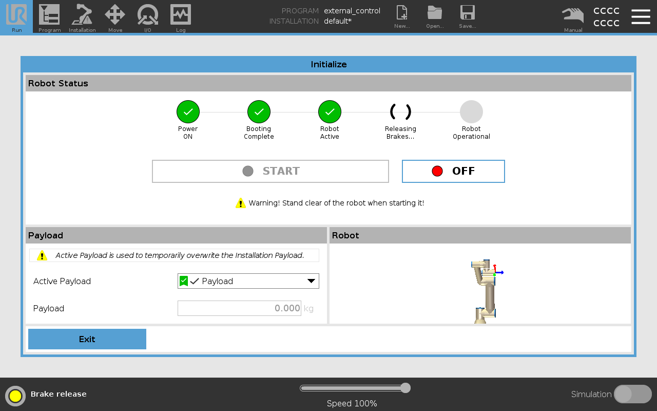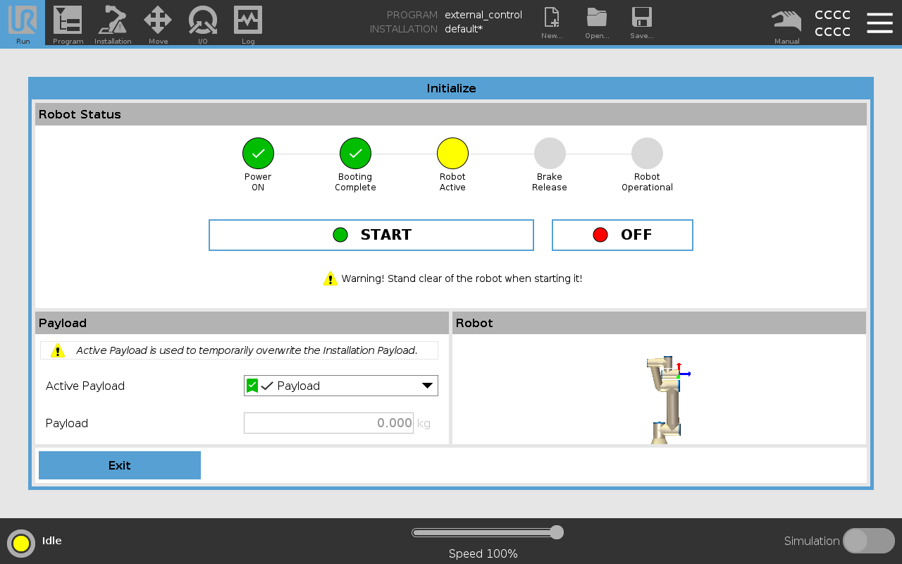 Once the robot is in normal mode, you can proceed to initialize the external control program.
