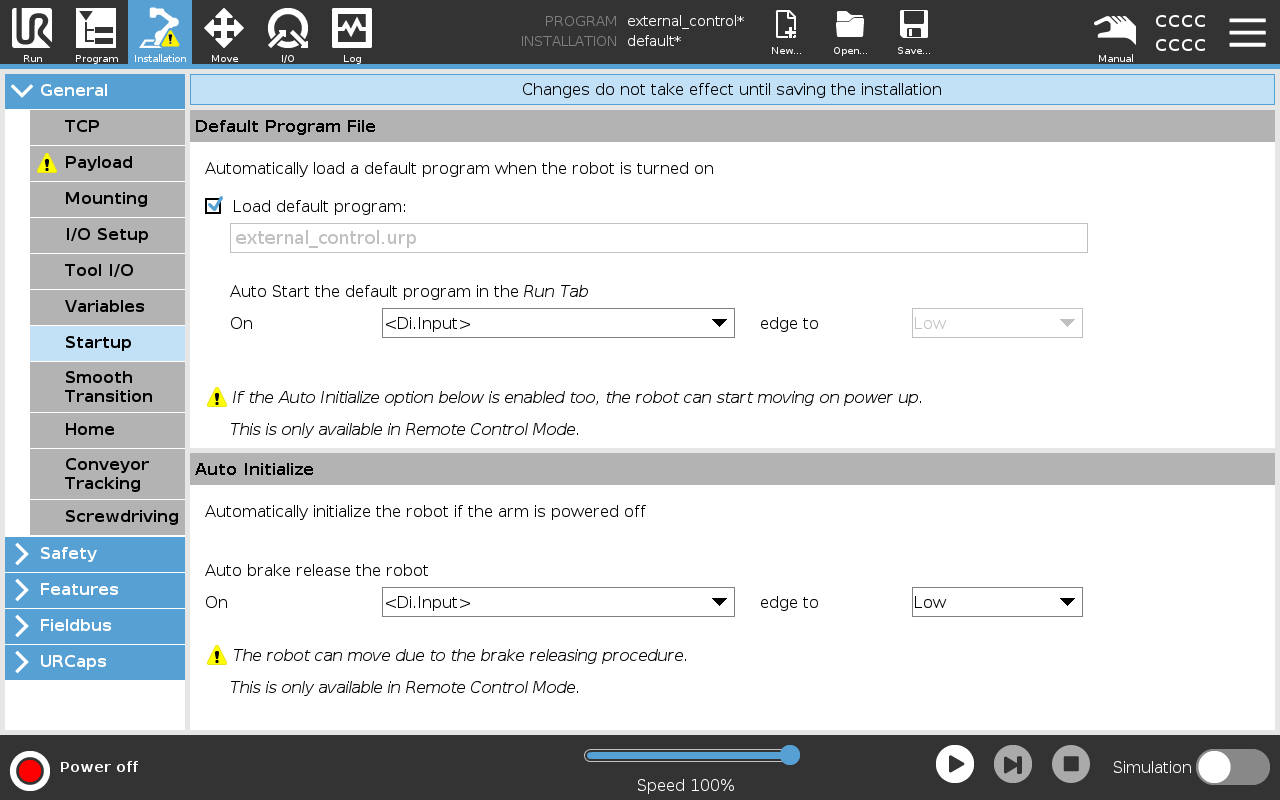 Now, set the program as default so that it is automatically loaded and ready to run on start-up. Navigate to the Installation/General/Startup page and set the external_control.urp program as the default: