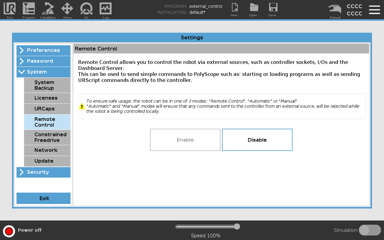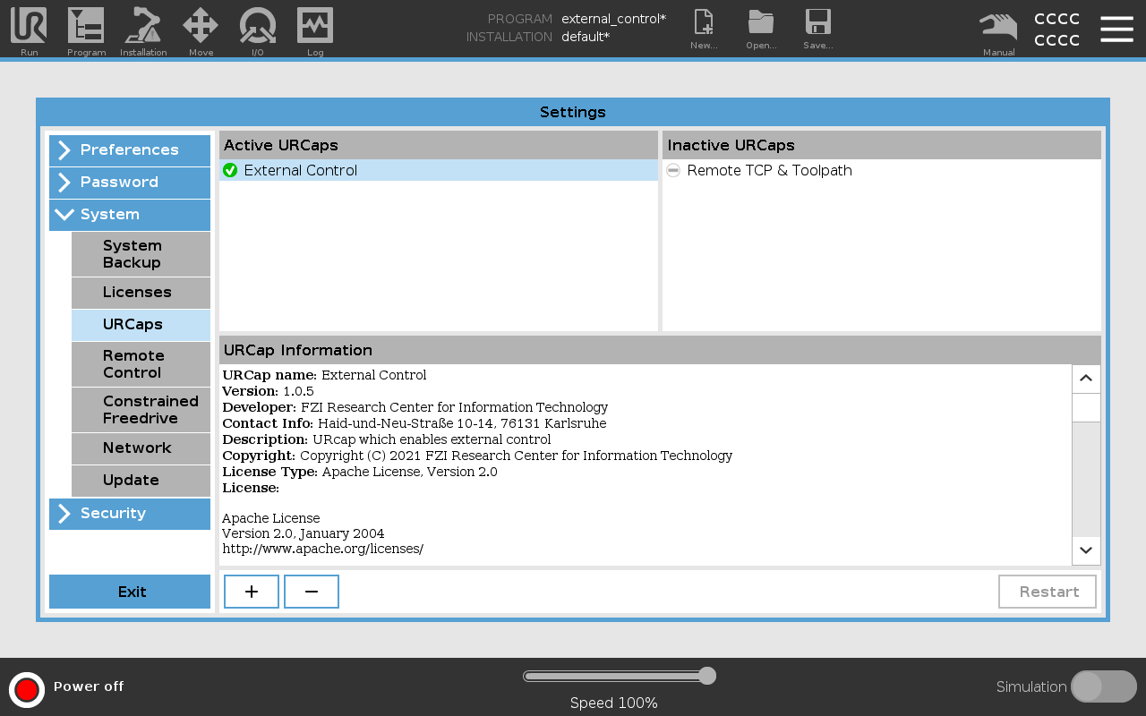 In order to control the arm from an external device, the External Control URCap needs to be setup. You can find the latest externalcontrol-x.x.x.urcap in its repository. Install it by adding it to the programs folder in the /, root directory of the arm's control box. Use a USB stick or scp.