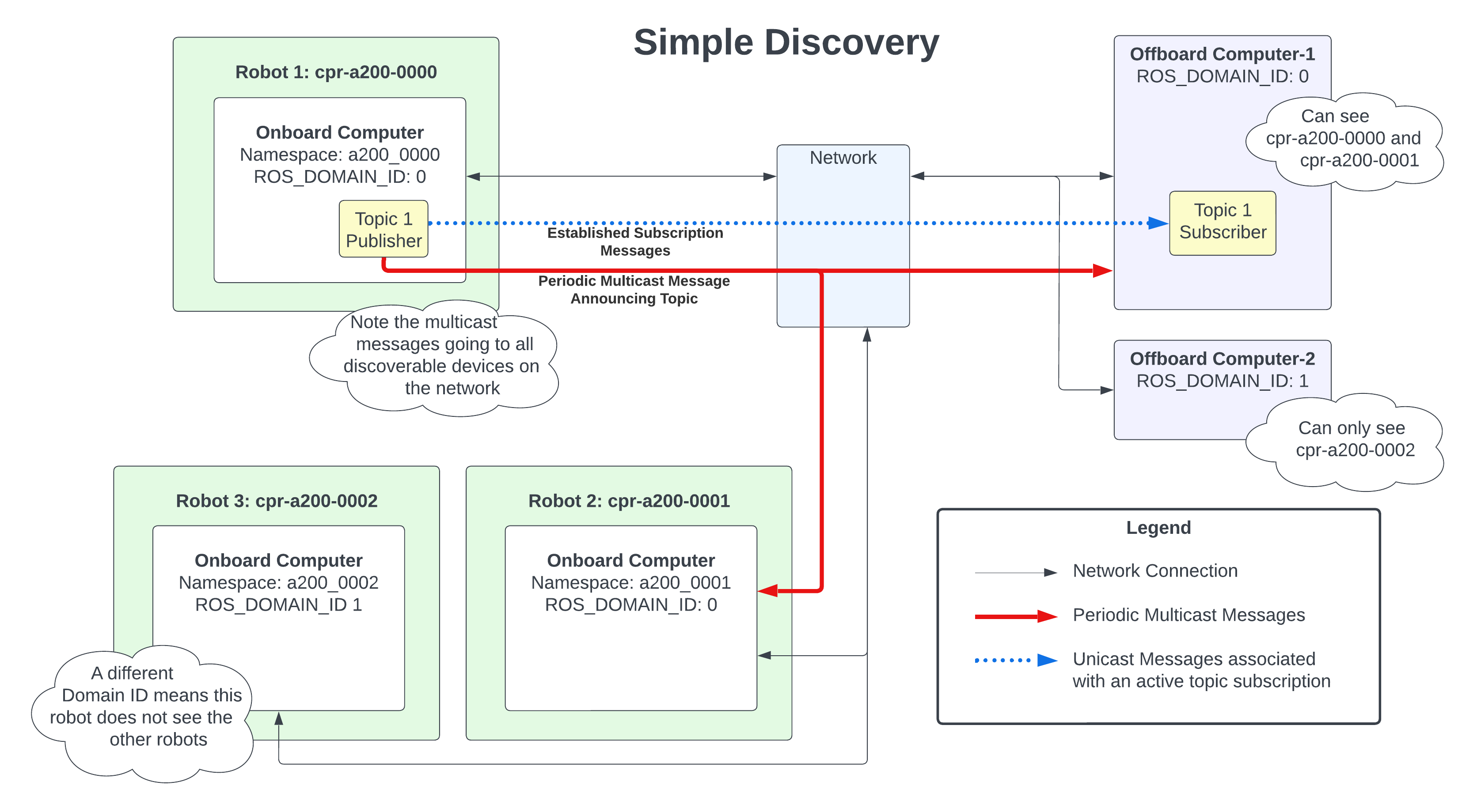 The Clearpath robot packages currently support eProsima Fast DDS as the ROS Middleware (RMW) Implementation. This middleware has two supported options for ROS 2 node discovery, Simple Discovery and Discovery Server. Each of these discovery mechanisms has their own use case: