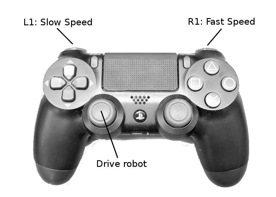 With the robot services running, turn on your controller. Press and hold either L1 or R1, and use the left joystick to publish a linear velocity and yaw command. The L1 button will drive the robot at slow speeds, while R1 will drive the robot at fast speeds (only supported on some robots).