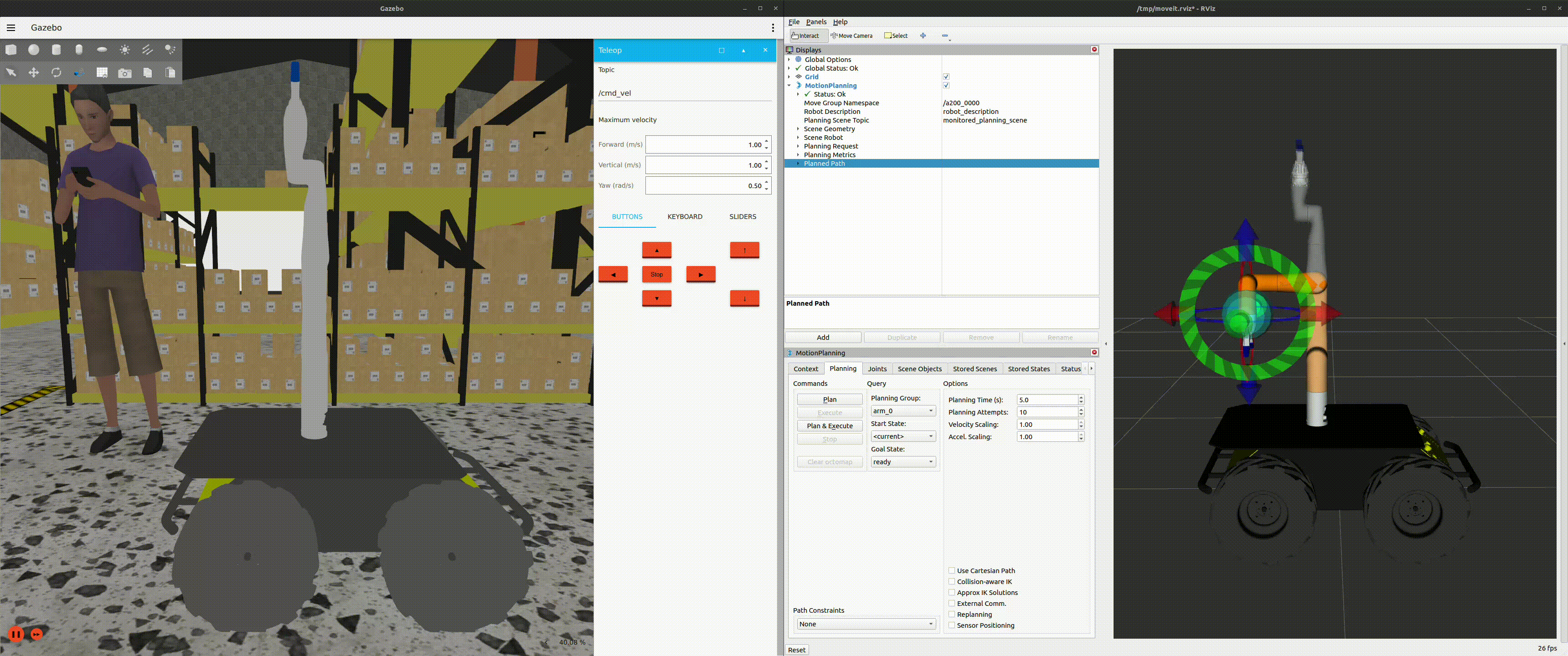 At this point, you will have the platform and manipulator controllers loaded and activated; you can send joint commands to the manipulators and velocity commands to the platform. However, depending on the joint states sent, the manipulators may collide with itself or the platform. Therefore, it is recommended to use MoveIt! to plan and execute collision free paths.