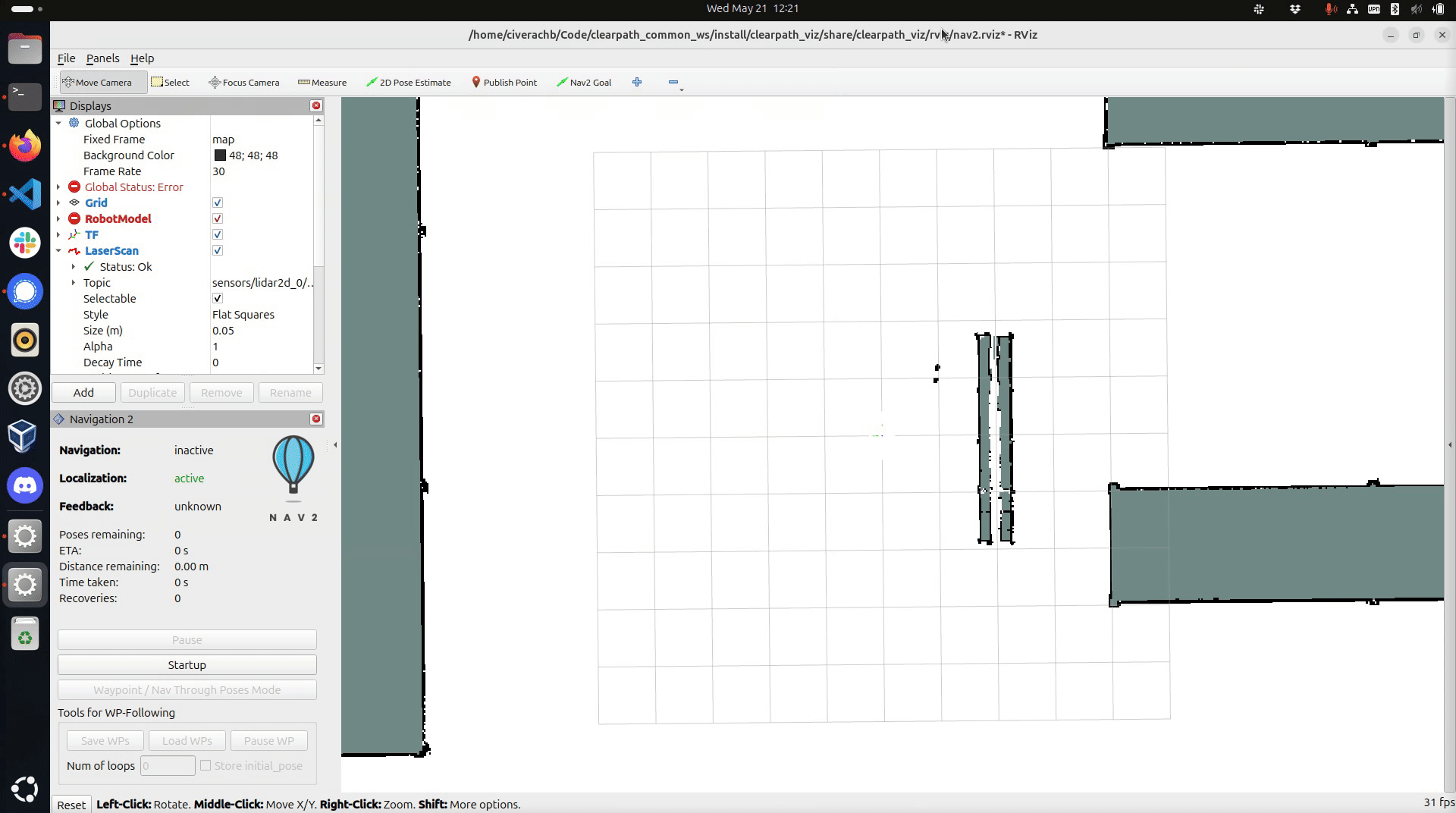 Localization is a method of tracking the robot's location within an existing map. It is generally done using laser scan data from a 2D LIDAR, and the robot's odometry. For this demo we are using the Nav2 package launch localization.