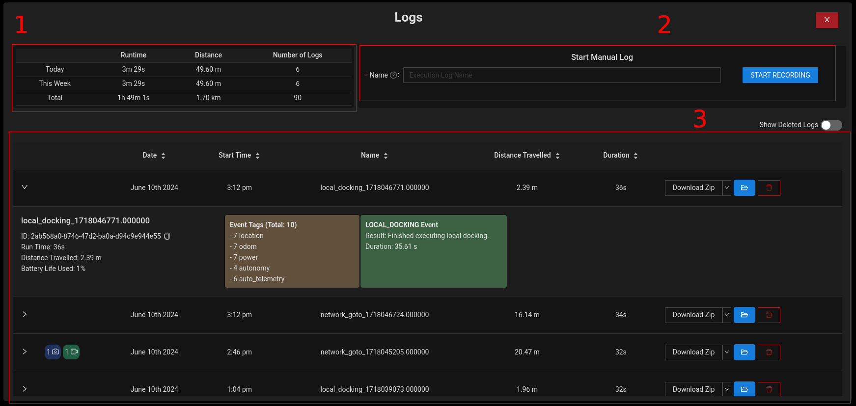 - Executed Logs: Logs that have executed on the UGV. These can be expanded to show high level information related to events that occurred during the recording.