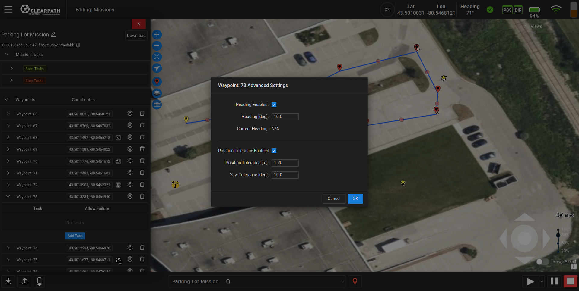 When creating a Waypoint, the user has the option of setting a final heading for the Waypoint. For example, when creating a Waypoint at an inspection point, the user may want the UGV to navigate and stop facing a certain direction. In Waypoint Panel, the list of Waypoints can be seen and the advanced settings of each Waypoint can be accessed by clicking the "Gear" icon.