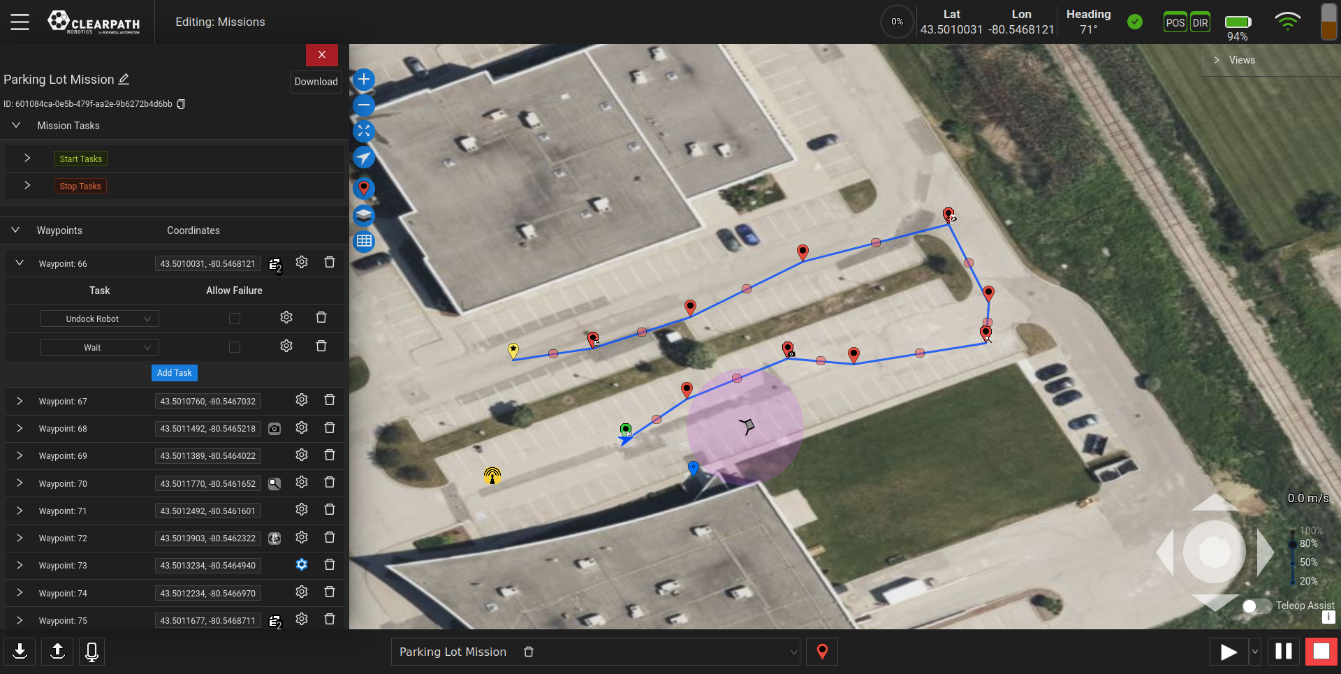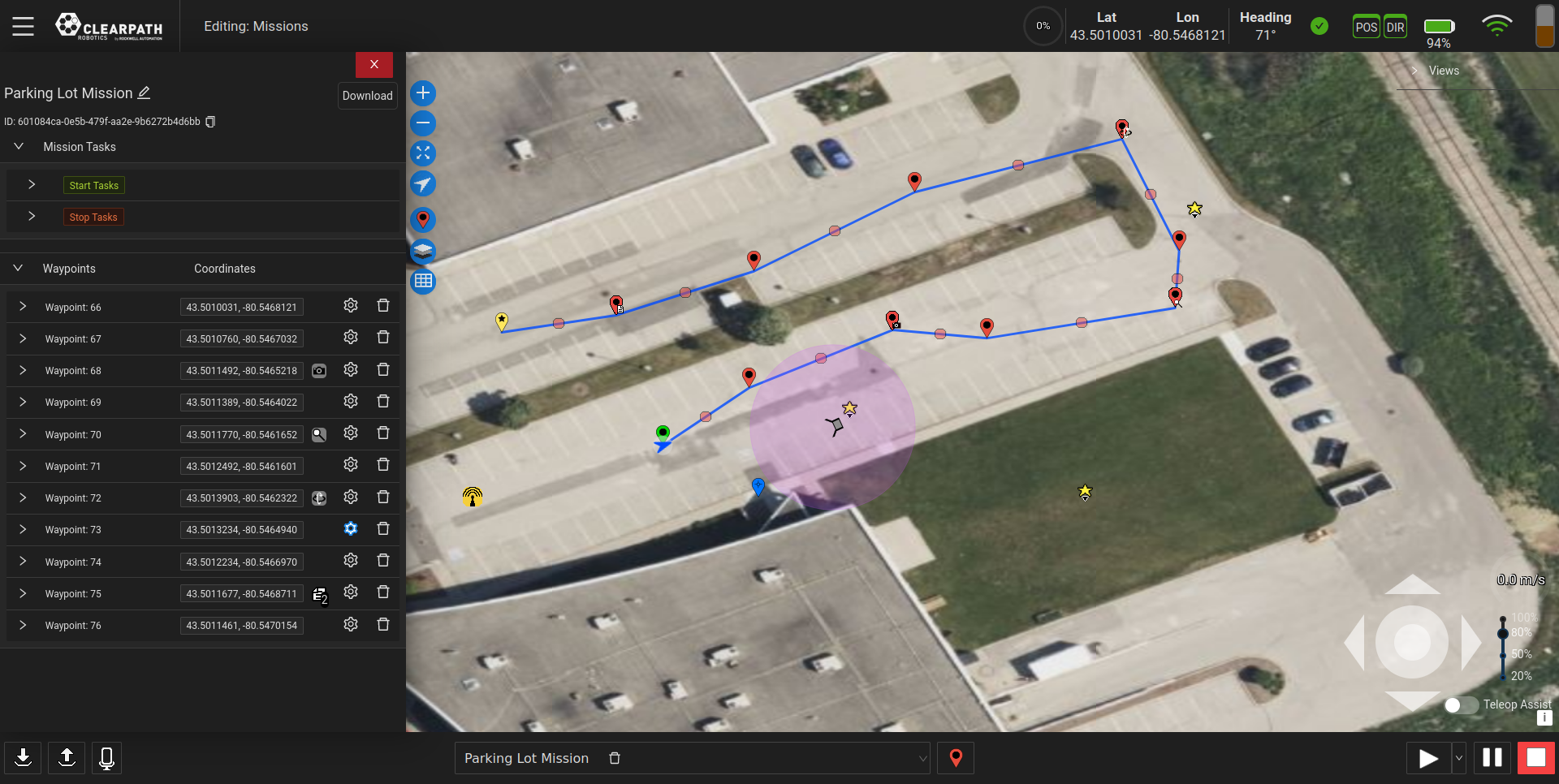 There are multiple ways to start a Mission. At the bottom of the UI, the user has the ability to start the currently selected Mission by clicking the "Play" button . Starting the Mission this will start the Mission from the first Waypoint. The user may also select the drop down next to the button to start the Mission from the current UGV position. This is a useful way to start a Mission in the event that the UGV was blocked by obstacles that were later moved. Another way that a user can start a Mission is by selecting a waypoint in edit mode and then clicking on "Start Mission from Here" option. If the UGV is within 3 metres of that Waypoint the Mission will start from there.