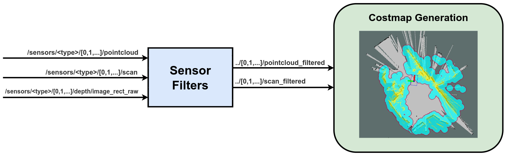 The detection sensors available on the UGV will have their data filtered, if necessary into data that can be fed into the costmap(s). The costmap will then use this filtered data to generate two costmaps (local and global).