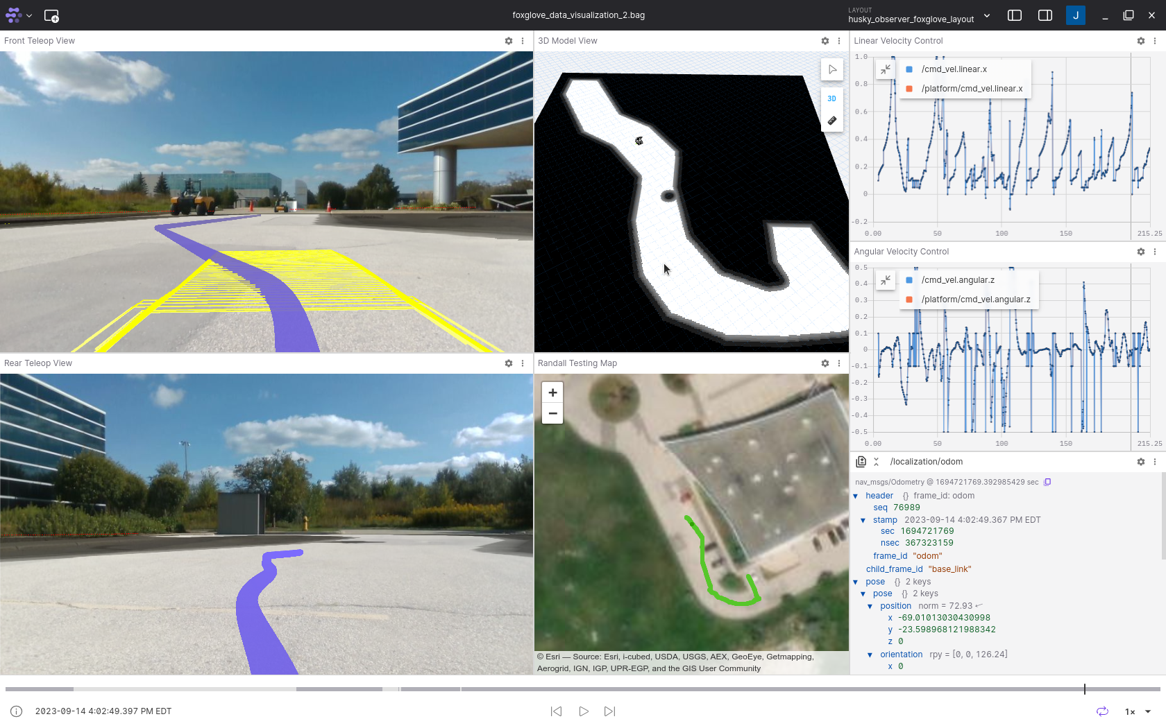 We have enabled Foxglove visualization as part of OutdoornNav, for improved debugging and data visualization and analysis. To access the Foxglove visualization interface for standard OutdoorNav configurations, navigate to the following URL.