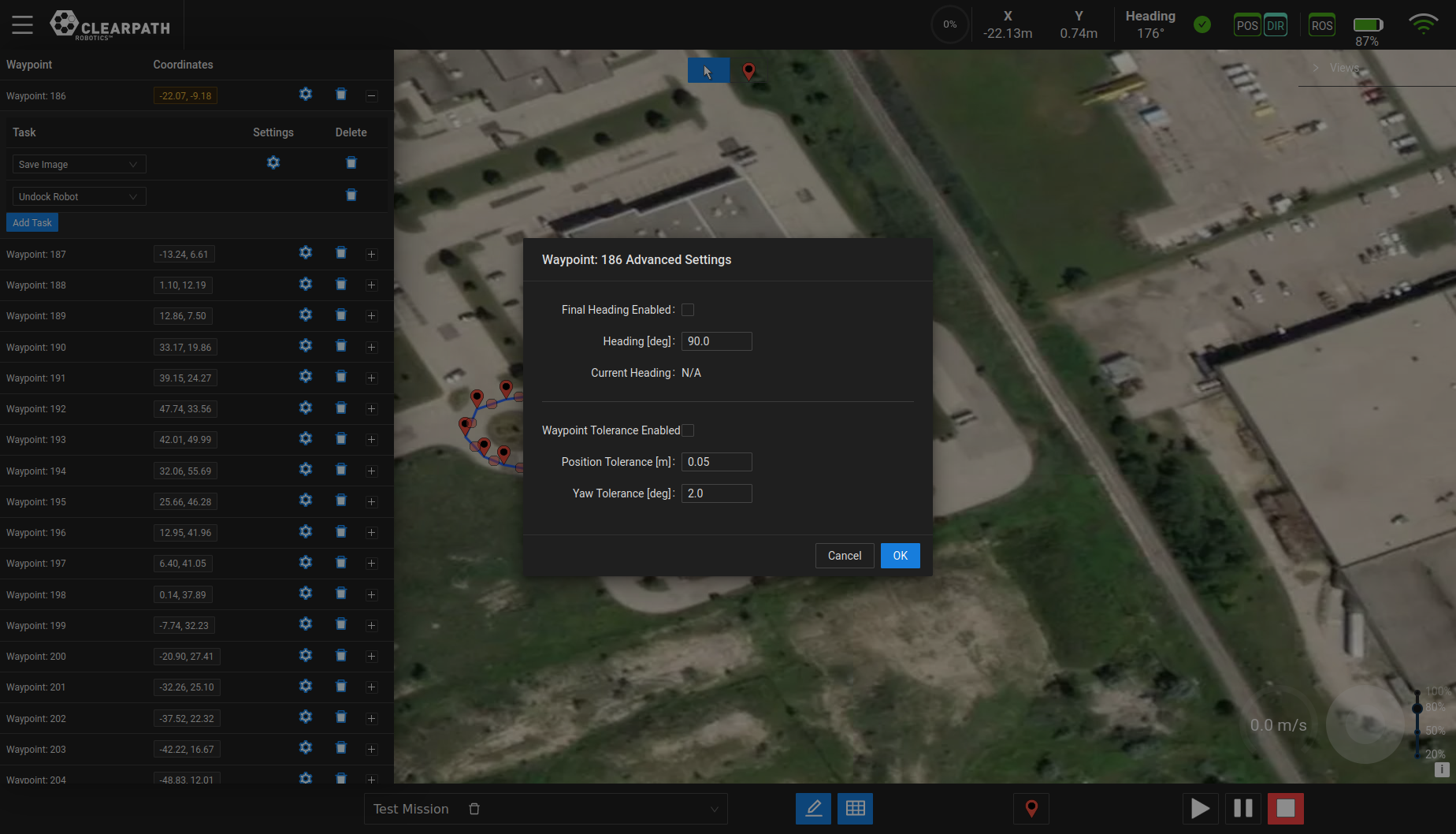 When creating a Mission, the user has the option of setting a specific tolerance for each Waypoint. By default, the Waypoint position and orientation tolerances are 0.3 meters and 180°, respectively. If a specific Waypoint requires that the tolerances be either increased or decreased, these values can be modified in the advanced settings. For example, if it's required that the position and/or orientation at a Waypoint be very accurate, such as 0.1 meters position and 5° orientation, or looser at 1.0 meter position, this can be done within these settings.