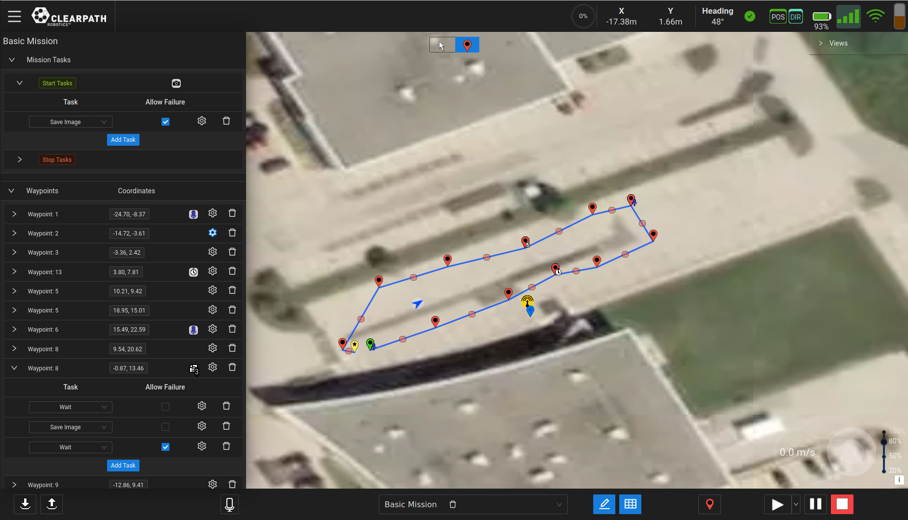 Enable the "Waypoint Panel" toggle to open the list of available Waypoints within the selected Mission as shown in the figure above. The user can now rearrange the list, rename Waypoints, add Tasks to the Waypoints, and modify the final heading and/or tolerance of each Waypoint.