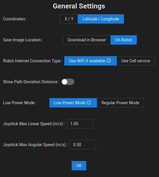 If the UGV is equipped with SIM card and can switch between Cellular and WiFi connections, the Operator can manually trigger this change through the general settings page. This switchover will take approximately 30 seconds and will require a refresh on the UI.