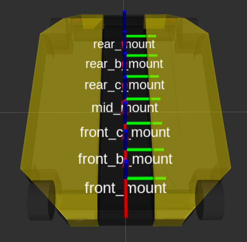 Dingo-D has 6 evenly-spaced mounting points along its center channel for mounting sensors and other accessories. Dingo-O has 7 similar mounting points. The centers of these mounting points are represented as links in the URDF to facilitate adding sensors to simulated robots and modelling collisions when planning arm motions for mobile manipulation.