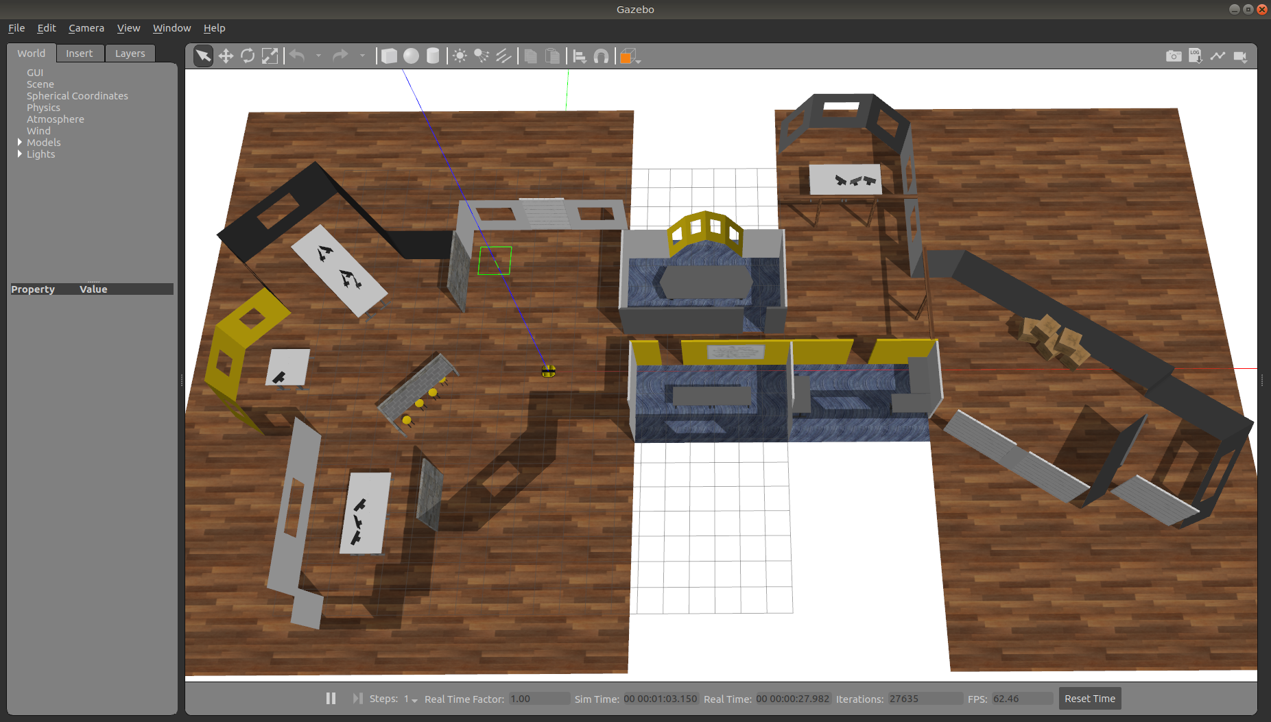 Office World is a small indoor environment representing a commercial office space. It features several large, open areas with furniture, as well as a narrow hallway with smaller offices and meeting rooms. It is intended to simulate missions in commercial spaces, such as facilitating deliveries, security monitoring, and inspecting equipment.