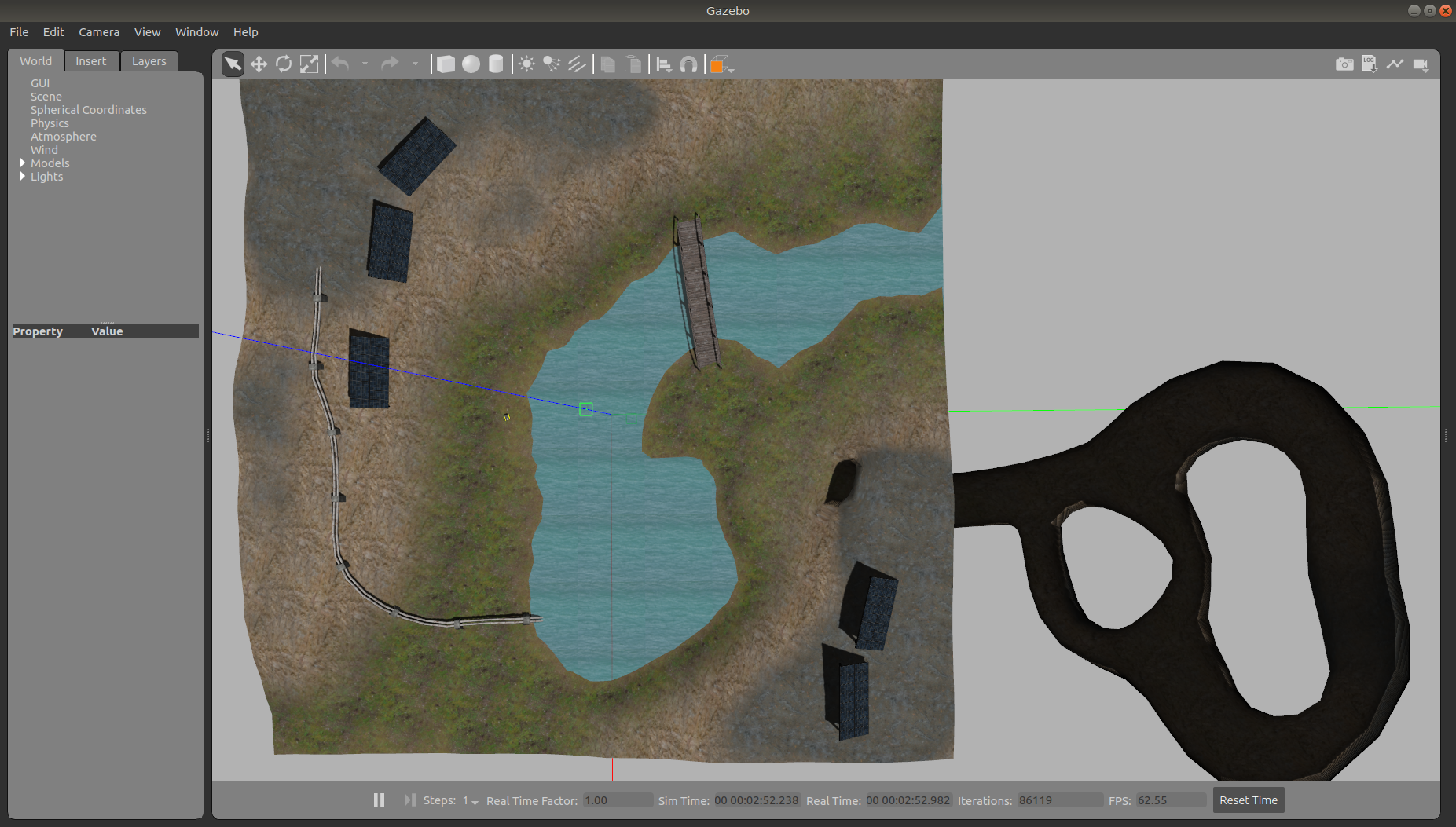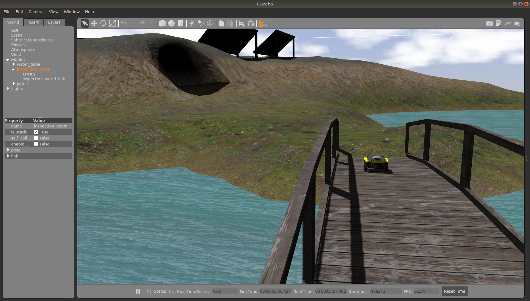 Inspection World is a hilly, outdoor world that includes a water feature, bridge, pipeline, small cave/mine, and a small solar farm. It is intended to simulate a variety of missions, including pipeline inspection, cave/underground navigation, and localization on non-planar terrain.