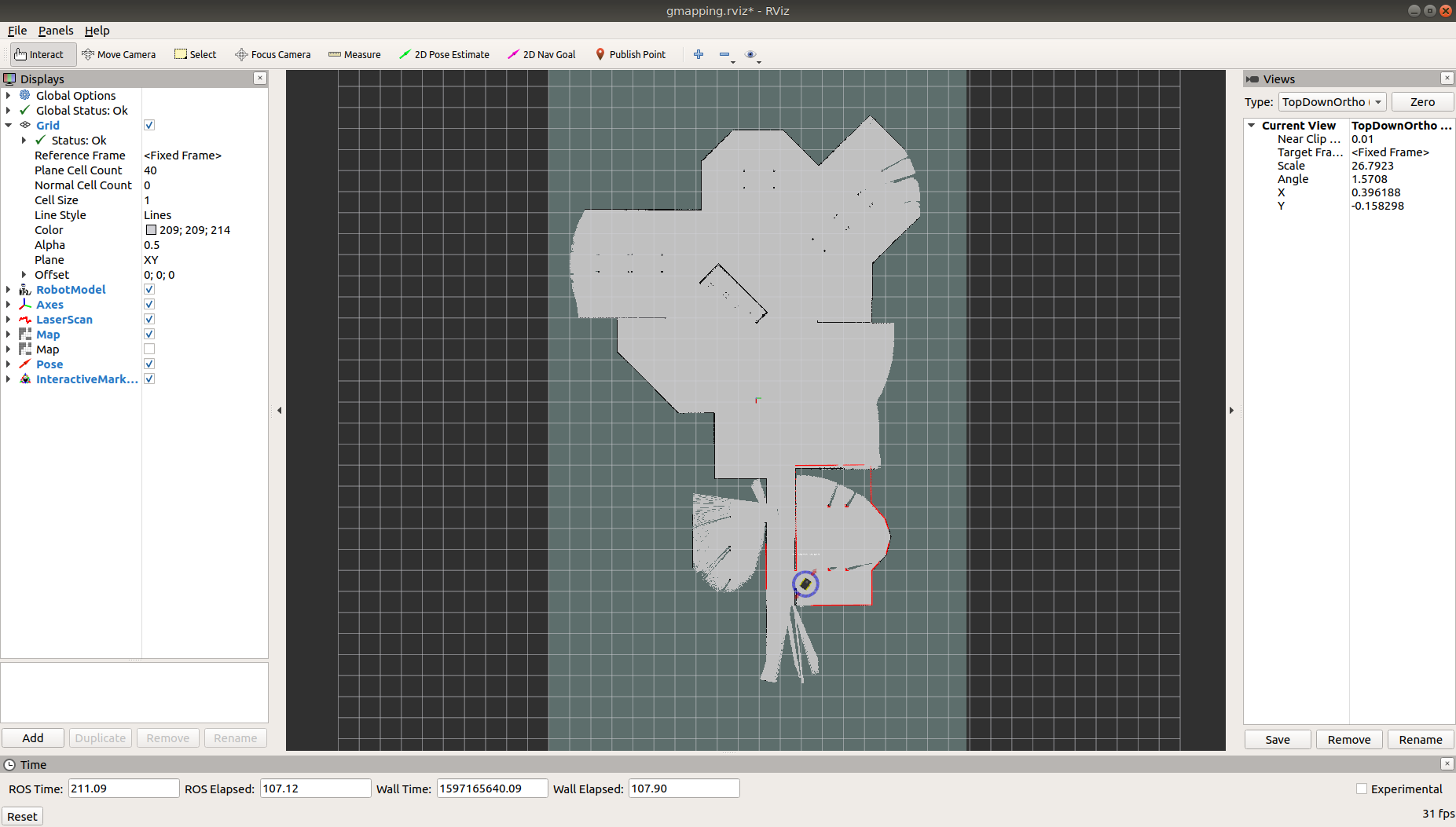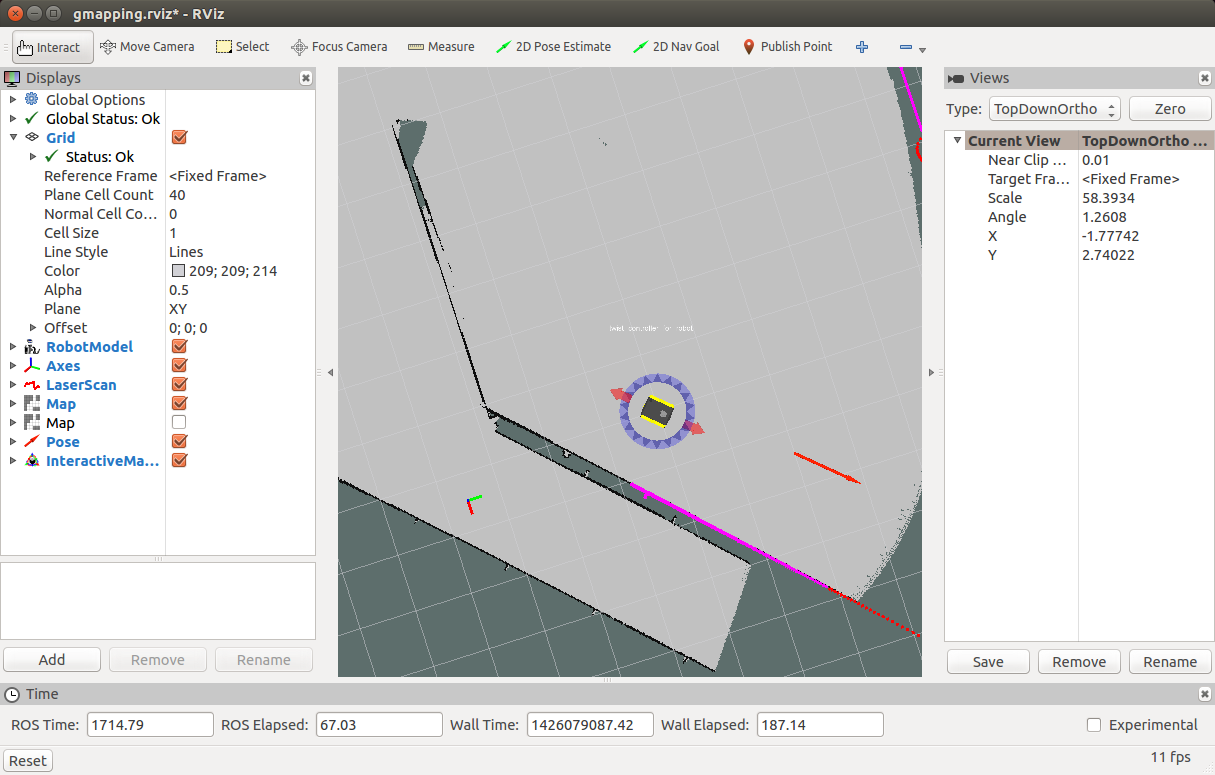 Once the simulation is running you can use RViz and other tools as described in Simulating Jackal and Navigating Jackal to control and monitor the robot. For example, below we can see the gmapping_demo from jackal_navigation being used to build a map of the Office World: