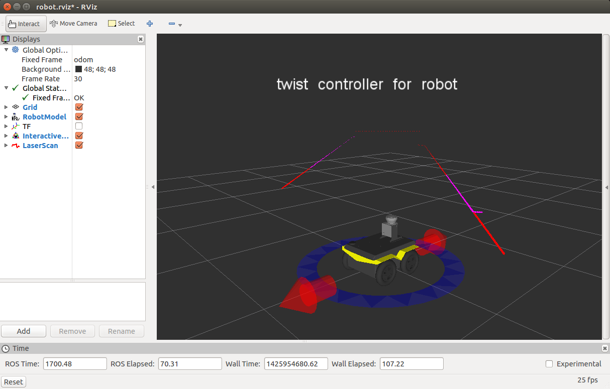 Once the simulation is running you can use RViz and other tools as described in Simulating Jackal and Navigating Jackal to control and monitor the robot.